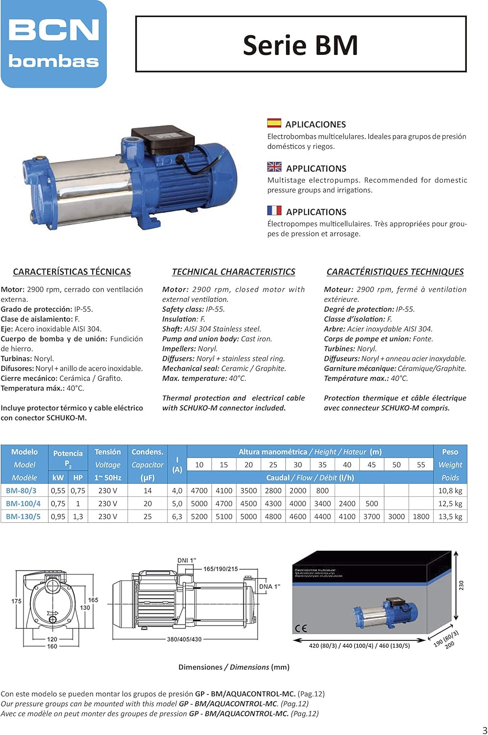 - Profundidade máxima de aspiração de 2 a 3 m. Eixo de aço inoxidável. Proteção IP-55